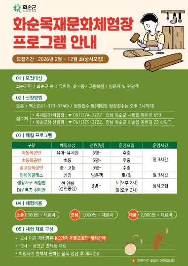 ![]() 화순목재문화체험장 프로그램 안내 홍보 포스터 |