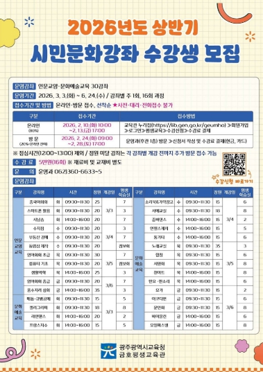 ![]() 광주 금호평생교육관, 시민문화강좌 수강생 모집 |