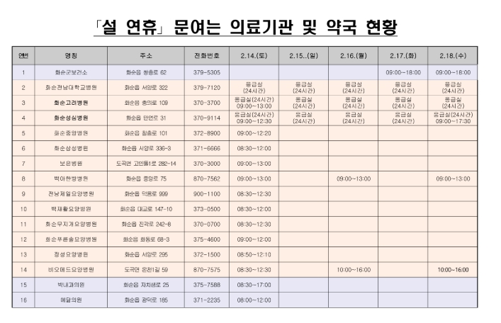 군은 설 연휴 기간에 지역응급의료센터인 화순전남대학교병원을 비롯해 병원 13개소, 의원 50개소, 보건소 1개소, 약국 24개소를 문 여는 의료기관 및 약국으로 지정·운영해 응급환자 발생에 대비하고 진료 공백을 최소화할 계획이다.