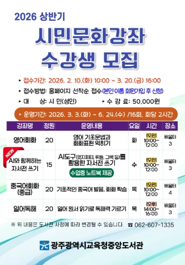 광주중앙도서관 김정희 관장은 “디지털 전환 시대를 맞아 시민들이 일상에서 인문학적 소양을 쌓고 새로운 기술을 익힐 수 있도록 다채로운 강좌를 준비했다”며 “시민들의 많은 관심과 참여를 바란다”고 말했다.