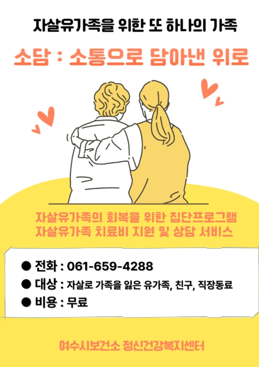 자세한 사항은 여수시보건소(학동) 정신건강복지센터로 문의하면 안내받을 수 있다.