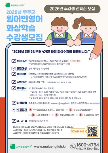 ![]() 2026 무주군 원어민영어 화상학습 수강생모집 |