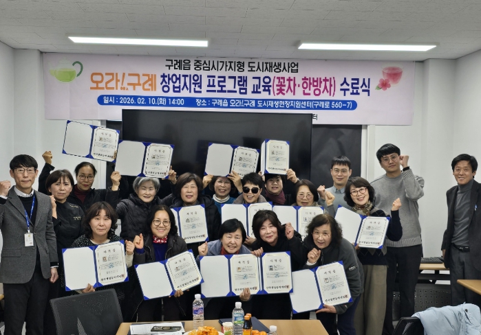[AI 호남뉴스]전남 구례군은 지난 10일 구례읍 도시재생현장지원센터 2층 교육장에서 '오라!구례 도시재생대학(온・오프라인 판매전략 교육)'과'오라!구례 창업지원 프로그램(꽃차・한방차 교육)'수료식을 개최했다.