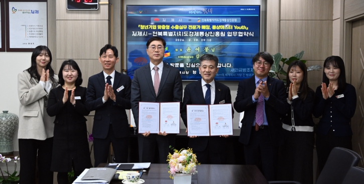 시는 '2026년 통상마스터 YOUTH 사업' 추진을 위해 19일 정성주 김제시장, 서해영 성장전략실장, 윤여봉 경제통상진흥원 원장, 김광희 마케팅통상본부장과 함께 업무협약을 체결했다고 밝혔다.