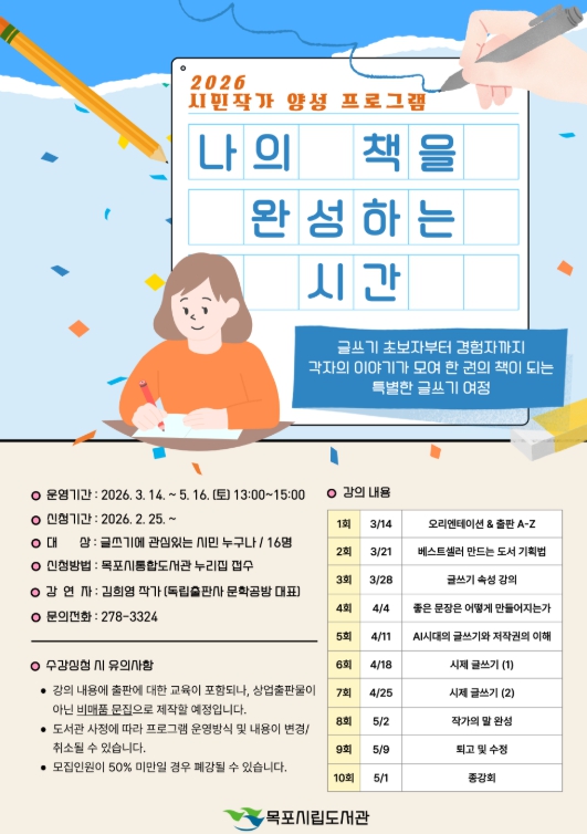 접수는 2월 25일부터 목포시통합도서관 누리집에서 선착순으로 진행된다.