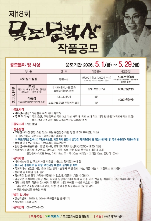 목포시 관계자는 “목포문학상은 문학적 성과를 기리는 것을 넘어, 목포가 지닌 인문학적 가치와 문학적 위상을 전국에 알리는 의미 있는 통로”라며 “참신하고 역동적인 작품들이 많이 접수되기를 기대한다”고 밝혔다.
