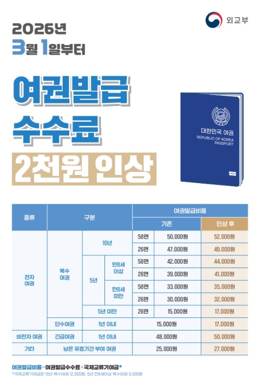 또한 5년 유효기간 복수여권(미성년자ˑ26면 기준) ▲만 8세 이상 41천 원 ▲만 8세 미만 32천 원으로 각각 인상된다.