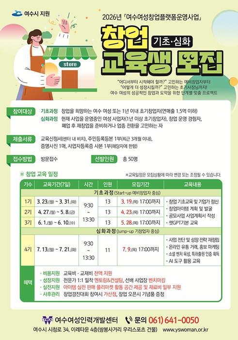 ![]() 2026년 여수여성창업플랫폼운영 창업 교육생 모집 포스터 |