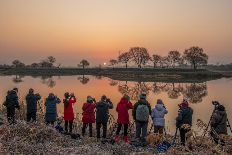 ![]() 남도풍경연구소 소속 사진작가들이 동섬에서 떠오르는 해를 촬영하고 있는 모습.(사진 제공-나주시) |