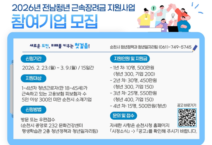 ![]() 순천시, 청년 근속장려금 참여 기업 모집 |