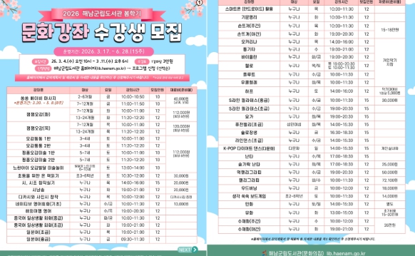 수강신청은 2026년 3월 4일부터 3월 11일까지 해남군립도서관 누리집을 통해 온라인 접수로 진행된다.