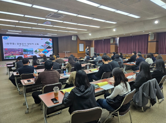 이어 오전 10시부터 12시까지는 5층 대회의실에서 전북특별자치도 감사위원회 주관‘찾아가는 기술감사 교육’이 진행됐다. 7급 이하 새내기 기술직 공무원(토목·건축·녹지 등) 약 70명이 참석한 가운데, 감사방향과 건설공사 단계별 주요업무, 실제 감사 사례를 중심으로 현장에서 빈번하게 발생하는 지적사항과 개선방안을 공유했다.