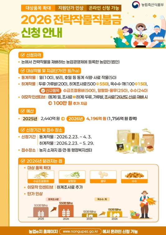 이 사업은 쌀값 안정을 위한 벼 재배 면적 감축 대책의 일환이다. 지원 자격은 농업경영체로 등록된 농업인과 농업법인, 식량작물공동경영체 등이며 작기별로 전략작물을 1000㎡ 이상 재배해야 하는 요건을 갖춰야 한다.