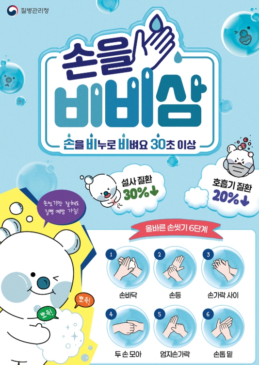 감염병 예방을 위해서는 외출 전후, 식사 전, 기침이나 코를 푼 뒤 흐르는 물에 비누로 30초 이상 손을 씻는 '올바른 손 씻기'를 생활화해야 한다.