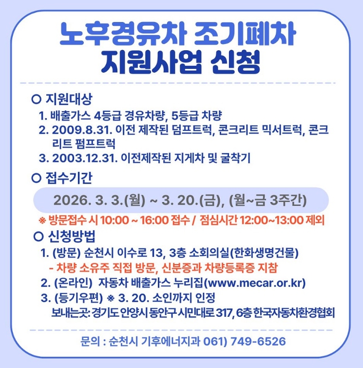 ![]() 2026년 조기폐차 보조사업 20일까지 접수 |