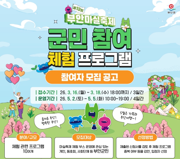 ![]() 제13회 부안마실축제 군민 참여 체험 프로그램 운영자 모집 |