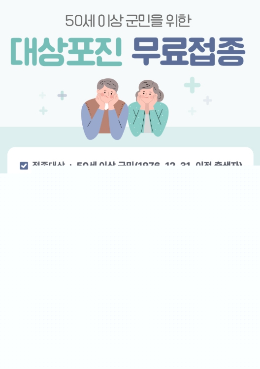 무료 예방접종은 대상포진 접종 이력이 없는 50세 이상(1976년 12월 31일 이전 출생자) 군민을 대상으로 생백신 1회 접종한다.