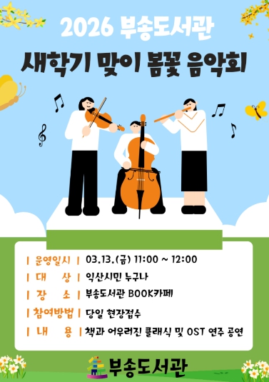 익산시는 부송도서관에서 오는 13일 오전 11시 '새학기 맞이 봄꽃 음악회'를 개최한다고 6일 밝혔다.
