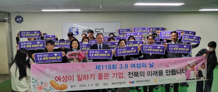 행사에는 방상윤 전북자치도 복지여성보건국장, 허명숙 전북여성가족재단 원장, 김성훈 농협은행 전북본부장이 참석해 여성 근로자들에게 장미꽃과 빵을 전달하며 세계 여성의 날의 의미를 함께 나누고 근로자들을 격려했다. ‘빵’은 생존권과 노동권을, ‘꽃’은 참정권과 존엄을 상징한다.