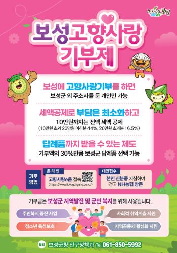 ![]() 보성군, 고향사랑기부 민간 플랫폼 ‘위기브’와 모금 계약 체결_2026 보성 고향사랑기부 포스터 |