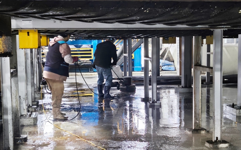 이들은 일반 청소로는 닦기 힘든 기계 설비 하단부와 바닥에 딱딱하게 굳은 기름때를 특수 약품으로 완벽히 벗겨냈다.