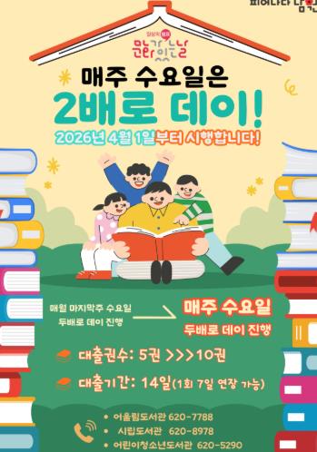 ![]() 남원시공공도서관 ‘문화가 있는 날’ 확대 운영-매주 수요일, 도서관의 즐거움이 두 배! |