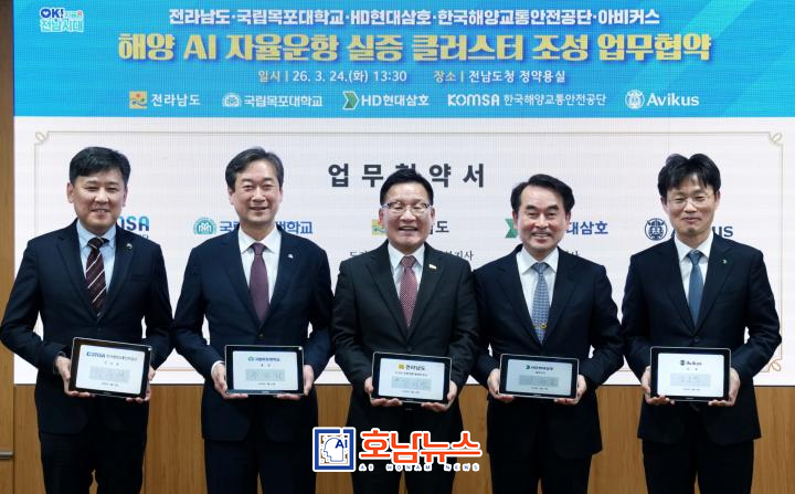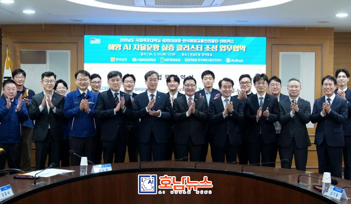 전남도는 24일 도청에서 국립목포대학교, HD현대삼호, 한국해양교통안전공단(KOMSA), 아비커스와 함께 ‘해양 AI 자율운항 실증 클러스터 조성’ 업무협약(MOU)을 체결했다.