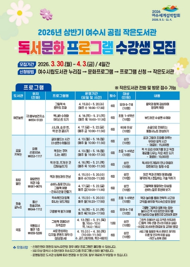 ![]() 2026년 상반기 여수시 공립 작은도서관 ‘독서문화 프로그램 수강생 모집’ 안내 포스터 |
