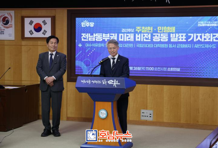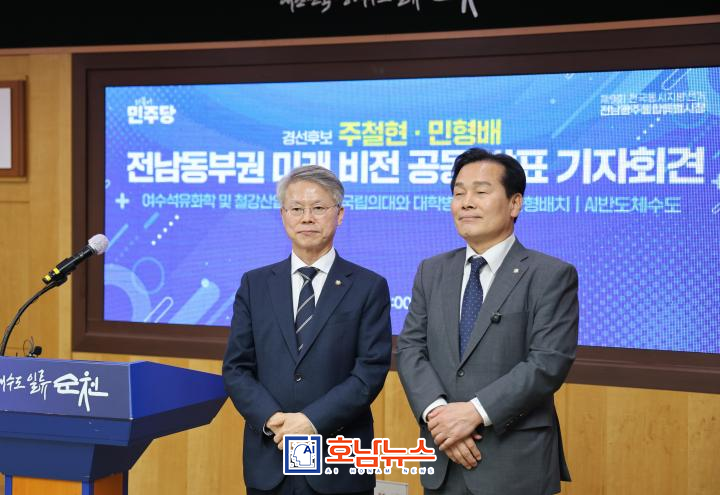 더불어민주당 경선에 나선 민형배 국회의원(광주 광산구을)과 주철현 국회의원(전남 여수갑)은 26일 전남 순천시청에서 공동 기자회견을 열고, 전남 동부권 미래 전략을 중심으로 한 정책 연대를 공식 선언했다.