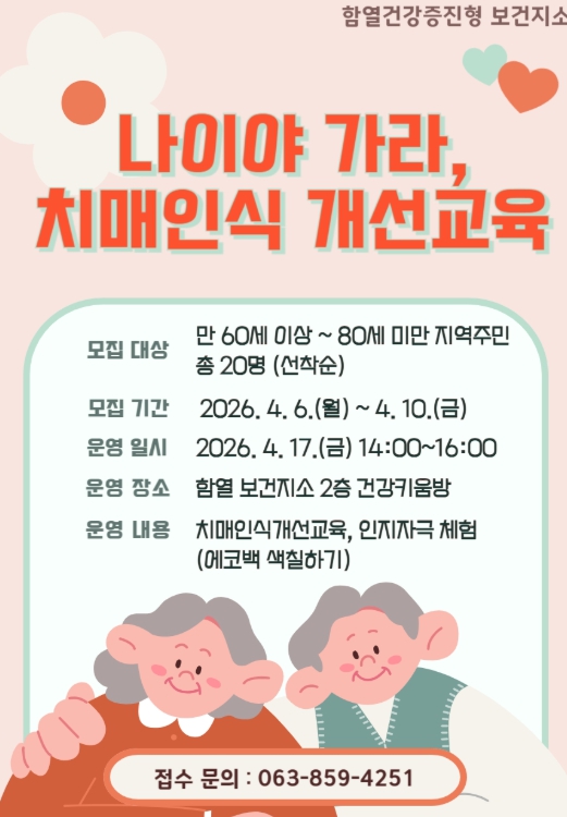 익산시 함열건강증진형 보건지소는 6일부터 10일까지 '나이야 가라, 치매 인식개선 교육' 참여자 20명을 모집한다.