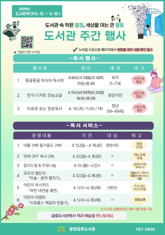 광양금호도서관은 4월 12일부터 18일까지 도서관주간 기간 동안 ▲잡지드림·무료나눔 ▲모두의 챌린지(예술책 펼치기) ▲슈링클스 책갈피 만들기 등 다양한 독서·문화 이벤트도 함께 운영할 예정이다.