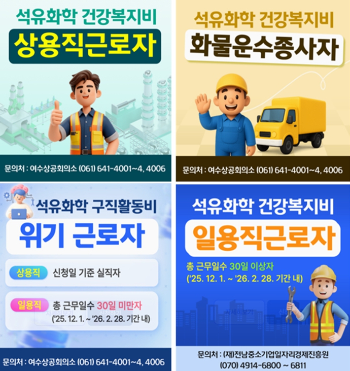 주요 사업은 ▲석유화학산업 상용직·일용직·화물운수종사자 안심패키지 지원사업 ▲석유화학산업 위기근로자 새출발 희망 지원사업 등이다.