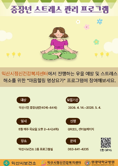 양찬모 익산시정신건강복지센터장은 "이번 프로그램을 통해 중장년층이 스트레스 관리 능력을 키우고 보다 건강한 삶을 이어가길 기대한다"며 "앞으로도 시민의 마음건강 회복을 위한 다양한 프로그램을 지속적으로 운영하겠다"고 말했다.