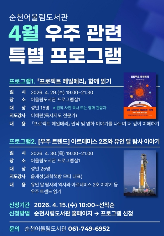 시 관계자는 “이번 프로그램을 통해 시민들이 우주를 보다 친근하게 이해하고, 독서와 과학이 결합된 의미 있는 문화 경험을 하길 바란다”며 “앞으로도 어울림도서관은 특성화를 살린 다양한 프로그램을 지속적으로 운영하겠다”고 전했다.
