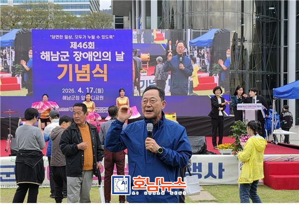 더불어민주당 해남군수 예비후보인 명현관 후보가 장애인의 날을 맞아 열린 기념행사에 참석해 장애인과 가족, 관계자들을 격려하며 포용적 지역사회 구축 의지를 공식화했다.
