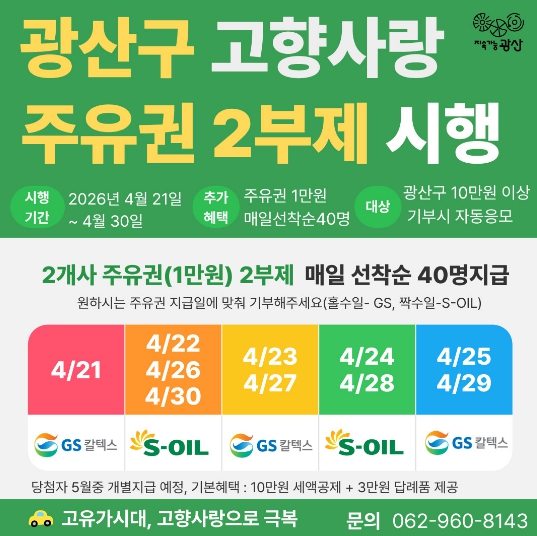 주유권 2부제 행사는 광산구에 10만 원 이상 기부한 기부자를 대상으로 매일 40명에게 선착순으로 주유권 1만 원을 지급한다.