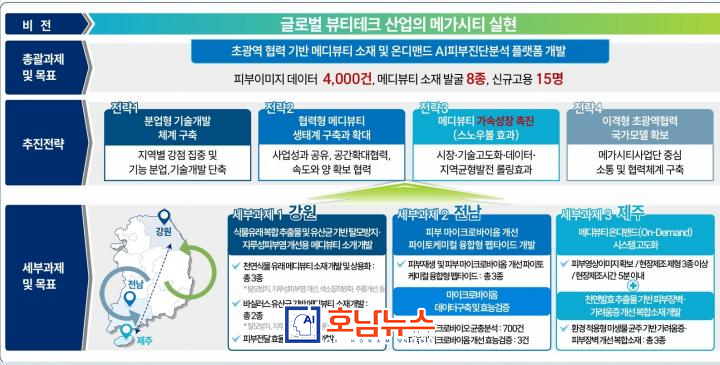 주요 사업 내용은 ▲지역특화 바이오소재를 활용한 고기능성 메디뷰티 소재 개발 ▲피부 데이터 표준화 및 실시간 통합관리 플랫폼 구축 ▲개인별 피부 상태에 맞는 최적 소재를 추천하는 AI 모델 개발 등이다.
