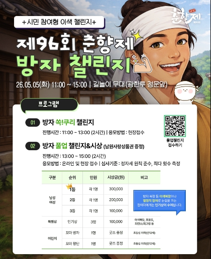 특히 그간 춘향과 몽룡에 가려져 있던 감초 캐릭터 ‘방자’를 전면에 내세웠다는 점에서 눈길을 끈다. 남녀노소 누구나 역동적으로 즐길 수 있도록 기획된 이번 챌린지는 5월 5일 오전 11시, 길놀이무대에서 본격적인 막을 올린다.