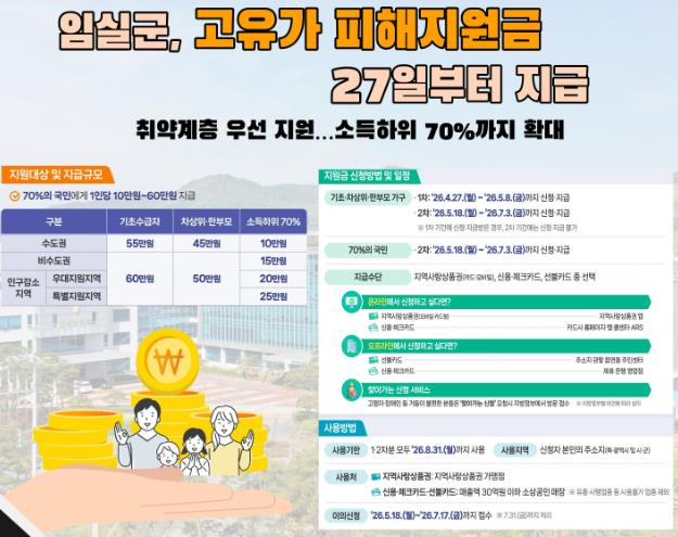 이번 지원은 2026년 3월 30일 기준 임실군에 주소를 둔 군민을 대상으로 하며, 기초생활수급자와 차상위가구, 한부모 가족을 비롯해 소득 하위 70% 범위에 해당하는 군민까지 폭넓게 포함된다.