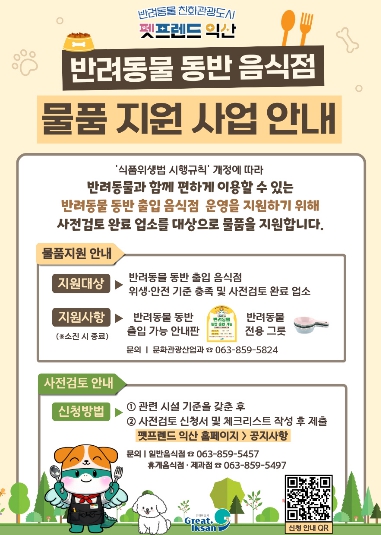 사전검토에 대한 자세한 내용은 '펫프렌드 익산' 누리집에서 확인하거나 미식위생과(일반음식점 063-859-5457, 휴게음식점·제과점 063-859-5497)로 문의하면 된다. 물품 지원은 문화관광산업과를 통해 안내받을 수 있다.
