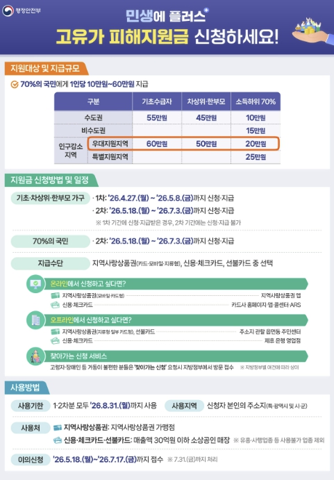 지급 금액은 인구감소지역 우대 기준을 적용해 기초수급자 60만 원, 차상위·한부모 및 소득 하위 70% 가구는 각 20만 원을 지급한다.