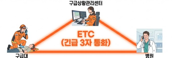 ETC는 구급대와 구급상황관리센터, 의료기관을 동시에 연결하는 긴급 3자 통화 방식으로, 중증응급환자 발생 시 현장에서 환자 상태를 실시간으로 공유하고 의료기관의 수용 가능 여부를 즉시 확인할 수 있도록 구축한 현장 중심 대응체계다.