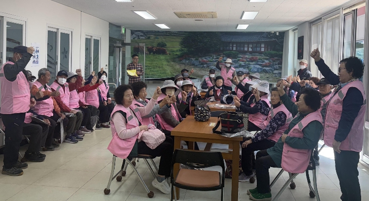 ![]() 나주시 노인일자리 참여자들이 활동 전 안전을 위한 구호를 외치고 있다. |