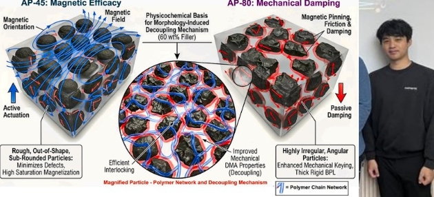 김병현 학생 연구팀은 외부 자기장에 따라 물리적 성질이 변하는 스마트 소재인 '자기유변탄성체(MRE)'의 성능을 획기적으로 조절하는 새로운 메커니즘을 규명했다.
