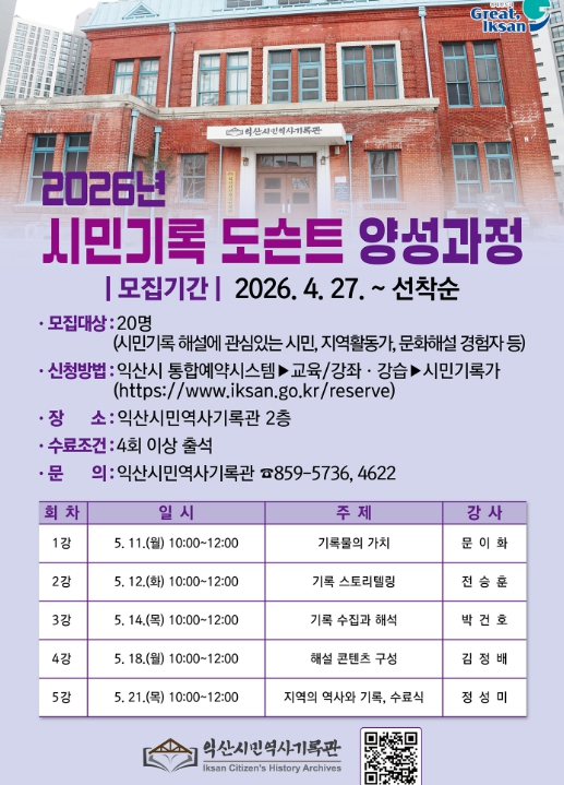 익산시는 '2026 시민기록 도슨트 양성과정' 수강생을 오는 27일부터 5월 7일까지 모집한다고 24일 밝혔다.