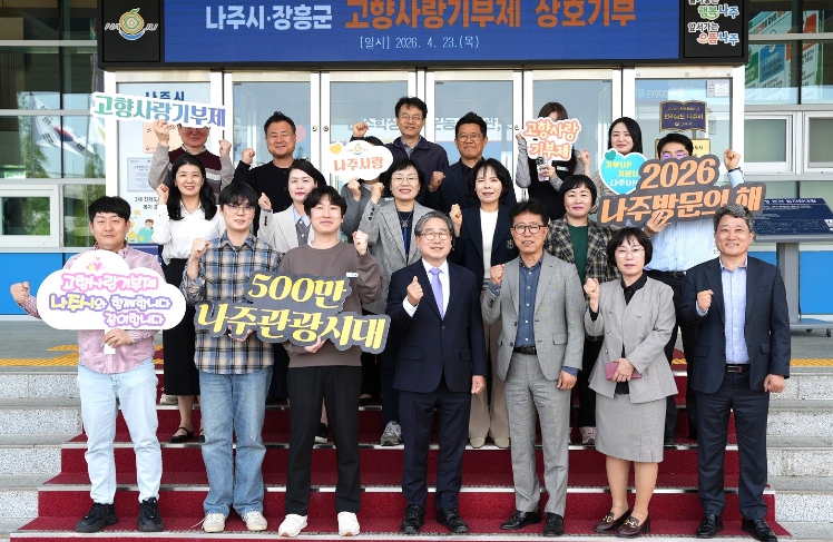 ![]() 나주시 문화예술과와 장흥군 문화관광실 직원들은 지난 23일 나주시청에서 고향사랑기부제 상호 기부에 동참하며 서로의 지역 발전을 응원했다. |