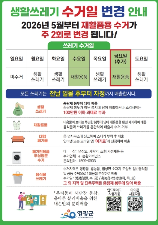 영광군 환경과 관계자는 “재활용품 수거 횟수 확대는 군민 생활 편의를 높이고 깨끗한 환경을 조성하기 위한 조치”라며 “우리동네 새단장을 위하여 군민들께서도 올바른 배출 문화 정착에 적극 참여해 주시기 바란다”고 당부했다.
