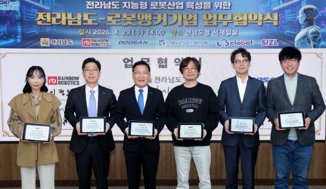 전남도는 29일 도청 서재필실에서 레인보우로보틱스, 두산로보틱스, 뉴로메카, 클로봇, 시즐 등 국내 로봇 앵커기업 5개사와 ‘지능형 로봇산업 육성을 위한 업무협약’을 했다.