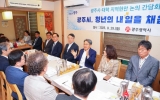 광주광역시 박인석 기자2025. 09.29[뉴스채널]광주시와 광주지역 대학 총장들이 대학 발전 방향과 청년정책 성과를 공유하고 앞으로 협력방안 등을 논의했다. 광주광역시는 29일 서구 치평동 한 음식점에서 광주지역 12개 대학 총장들과 ‘오찬 간담회’를 열고, 지역 대학 발전 방향과 협력 방안에 대해 논의했다. 또 광주만의 청년정책을 공유하고 국가AI컴퓨팅센터 유치에 대해 힘을 모으기로 했다. 이날 간담회에는 강기정 시장을 비롯해 전남대, 조선대, 호남대, 광주대, 남부대, 광주교대, 광주여대, 송원대, 광주과학기술원, 광주보건대, 동강대, 기독간호대 총장이 참석했...