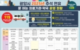 전라남도 박인석 기자2025. 09.29[뉴스채널]광양시는 시민과 귀성객들이 안전하고 편안하게 명절을 보낼 수 있도록 오는 10월 3일부터 9일까지 7일간 ‘추석 연휴 종합상황실’을 운영한다고 밝혔다. 추석 연휴 종합상황실은 생활민원기동반, 재난상황반, 진료대책반 등 총 6개 반으로 편성되며 266명의 인력이 투입된다. 시는 각종 비상 상황에 신속하고 체계적으로 대응함으로써 시민들의 생활 불편을 최소화하고 안전을 확보할 계획이다. 생활민원기동반은 환경, 도로, 교통, 수도, 쓰레기 수거, 가로등 등 일상과 직결된 민원을 집중 처리해 연휴 기간 발생할 수 있는 불편을 ...